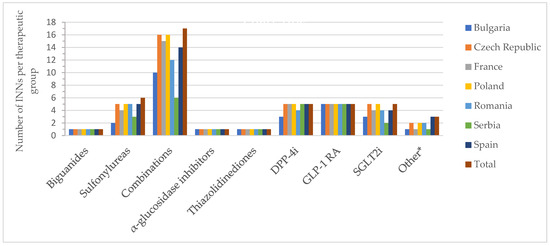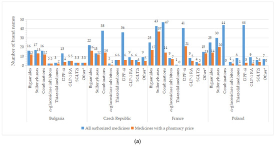There are two or more brand names marketed (having a price) for each INN for the majority of therapeutic groups (Table 2 and Table S2). Only one brand name is available for acarbose in the Czech Republic and Romania; the same holds true for pioglitazone in Poland, Romania, and Serbia. Several active substances from the DPP4-I class have only one brand name with a price: sitagliptin (Bulgaria, Romania, Poland), vildagliptin (the Czech Republic, Poland), and linagliptin (Bulgaria, the Czech Republic, Poland, Serbia, Spain; no drug in the rest of the countries). Repaglinide was the only representative from the A10BX group (other blood glucose-lowering drugs, excluding insulins) in the majority of the studied countries, found in a different number of brand names (Bulgaria and Romania—3, the Czech Republic—5, France—13, Serbia—2, Spain—17). In Spain, two other active substances were observed for the A10BX class, guar gum and nateglinide, with one brand name for each substance.