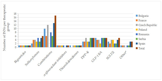 Number of authorized INNs (out of all approved INNs of a therapeutic group from all countries) by therapeutic group and country; * other = other blood glucose-lowering drugs.