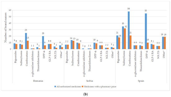 Total number of brand names for all diabetes medicines with marketing authorization and with a pharmacy price per therapeutic group and country: (a) Bulgaria, the Czech Republic, France, Poland; (b) Romania, Serbia, Spain. * Other = other blood glucose-lowering drugs.