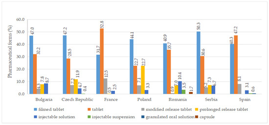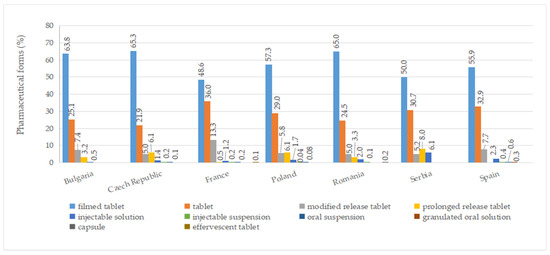 A total of ten pharmaceutical forms were identified for authorized medicines (Table S7). Two dosage forms (oral suspension and effervescent tablet) were apparently not marketed (no price available). Among the countries included in this study, France had the most diverse range of pharmaceutical forms for approved medicines, with a total of eight. This was followed by the Czech Republic, Poland, Romania, and Spain, each of which had seven different authorized pharmaceutical forms. As seen in Figure 5, the most commonly authorized pharmaceutical form was film-coated tablets, accounting for over 40% of the total, followed by conventional tablets, representing more than 20%. Capsules were only authorized in Romania, while effervescent tablets were exclusively approved in France. Granulated oral solution formulations were found solely in Spain. When considering medicines with a price, conventional tablets (>20%), film-coated tablets (>30%), injectable solutions, and modified-release tablets were available in all countries (Figure 6).
