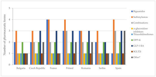 In this study, we intended to provide a better understanding of the range of authorized and available antidiabetic drugs (having a pharmacy price) in seven selected European countries. Not all authorized active substances were available on the market for patients in all countries surveyed, except Bulgaria. Spain had the highest number of medicines with a pharmacy price in terms of brand names (123), INNs (25 active substances and 13 oral fixed combinations), MAHs (44), and strengths (51). A study performed from 2006 to 2016 in eleven countries showed that only in Spain were all active substances from the new therapeutic classes—GLP-1 receptor agonists and SGLT-2 inhibitors—commercialized [27]. In this study, five substances from GLP-1 agonists were approved in all countries, one of them (lixisenatide) not being available on the market in the Czech Republic, France, and Poland. Only medicines based on dulaglutide and semaglutide were commercialized in Poland. All five agents from the group of DPP-4 inhibitors were marketed in the Czech Republic, Serbia, and Spain, whereas only four substances from the group of SGLT-2 inhibitors were found available in the Czech Republic, Poland, and Spain.