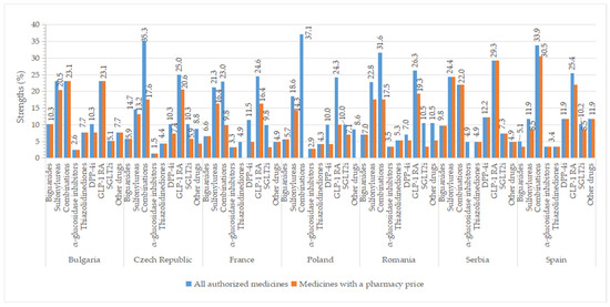 Higher percentages of authorized strengths were observed for GLP-1 agonists (>23%), oral fixed combinations (≥22%), and sulfonylureas (>11%) in all studied countries, whereas smaller percentages of strengths for groups represented by only one active substance like α-glucosidase inhibitors (<4%) and thiazolidinedione (<8%) (Figure 9). The number of approved strengths per INN is listed in Table S8. All four strengths authorized for metformin were commercialized in all countries, except Spain (where from three strengths, only two had a price). In Serbia, all authorized concentrations had a price (except for acarbose, which is unavailable, and saxagliptin, for which one of the two concentrations had a price). We found a difference of at least two strengths between all authorized medicines and those with a price for some representatives from sulfonylureas (the Czech Republic, France, Romania), combinations (except Bulgaria, Serbia), DPP-4 inhibitors (except Romania, Serbia, Spain), GLP-1 agonists (except Bulgaria, Romania, Serbia), SGLT2 inhibitors (France, Romania), and other blood glucose-lowering drugs (the Czech Republic, Romania).