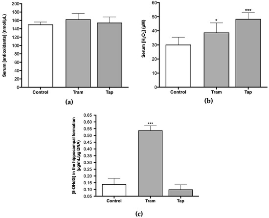 Therefore, analyzing antioxidant defenses and other oxidative stress parameters, such as ROS/RNS, at the systemic and hippocampal levels, after exposure to both opioids, was deemed pertinent. Following exposure to 50 mg/kg tramadol or tapentadol (equivalent to their maximum recommended daily dose) for eight alternate days, no statistically significant changes were observed regarding the serum concentration of antioxidants between the control and the opioid-administered groups (Figure 2a). However, concerning H2O2 serum concentration, statistically significant differences were observed. There was a 1.28-fold increase in serum H2O2 concentration in the animals that received tramadol (p < 0.05) and a 1.60-fold increase in the group administered with tapentadol (p < 0.001), both in comparison with the control group (Figure 2b). Since serum H2O2 concentration is a surrogate of ROS/RNS levels, it might be deduced that exposure to these opioids, under the conditions of this study, significantly elevates ROS/RNS concentration.
