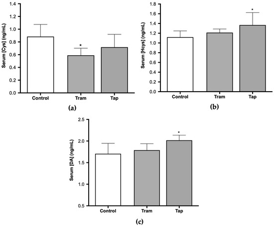 Serum cysteine (Cys) (a), homocysteine (Hcys) (b), and dopamine (DA) concentrations (c) in Wistar rats intraperitoneally administered with 50 mg/kg tramadol (Tram) or tapentadol (Tap) for eight alternate days. The results are expressed as means ± SD. * p < 0.05.