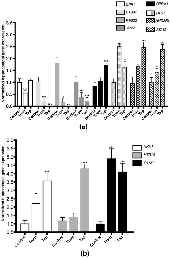 Normalized hippocampal gene expression levels of neurotoxicity and neuromodulation biomarkers upon Wistar rat daily intraperitoneal administration of 50 mg/kg tramadol (Tram) or tapentadol (Tap) for eight alternate days. Gene expression levels were normalized against the respective 18S ribosomal RNA (18S rRNA) gene expression and then against the respective controls (administered with normal saline). The results are expressed as means ± SD. * p < 0.05; ** p < 0.01; *** p < 0.001. CNR1: cannabinoid receptor 1-encoding gene; GFAP: glial fibrillary acidic protein-encoding gene; HTR7: 5-hydroxytryptamine receptor 7-encoding gene; ITGAM: cluster of differentiation molecule 11b (CD11b)-encoding gene; NMDAR1: N-methyl-d-aspartate receptor subunit 1-encoding gene; OPRM1: µ-opioid receptor 1-encoding gene; PTGS2: cyclooxygenase-2 (COX-2)-encoding gene; STAT3: signal transducer and transcription activator protein 3-encoding gene (a). CASP3: caspase-3-encoding gene; HRH1: histamine H1 receptor-encoding gene; HTR1A: 5-hydroxytryptamine receptor 1A-encoding gene (b).