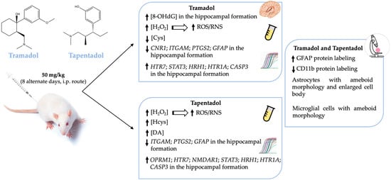 Schematic representation of the main systemic and hippocampal alterations observed in Wistar rats after in vivo exposure to 50 mg/kg tramadol or tapentadol for eight alternate days. CASP3: caspase-3-encoding gene; CD11b: cluster of differentiation molecule 11b; CNR1: cannabinoid receptor 1-encoding gene; Cys: cysteine; DA: dopamine; GFAP: glial fibrillary acidic protein; GFAP: glial fibrillary acidic protein-encoding gene; H2O2: hydrogen peroxide; Hcys: homocysteine; HRH1: histamine H1 receptor-encoding gene; HTR1A: 5-hydroxytryptamine receptor 1A-encoding gene; HTR7: 5-hydroxytryptamine receptor 7-encoding gene; i.p.: intraperitoneal; ITGAM: CD11b-encoding gene; NMDAR1: N-methyl-d-aspartate receptor subunit 1-encoding gene; 8-OHdG: 8-hydroxydeoxyguanosine; OPRM1: µ-opioid receptor 1-encoding gene; PTGS2: COX-2-encoding gene; RNS: reactive nitrogen species; ROS: reactive oxygen species; STAT3: signal transducer and transcription activator protein 3-encoding gene; ↑: increased levels; ↓: decreased levels.