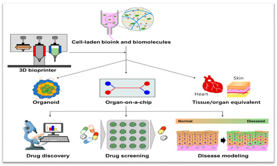 The 3D bioprinting technique, as originally defined by Mironov et al., is characterized as the utilization of material transfer processes to pattern and assemble biologically relevant materials, including molecules, cells, tissues, and biodegradable biomaterials, in a predetermined organization with the aim of executing one or more biological functions [19]. This groundbreaking approach holds the potential to establish a novel standard method for the generation of biological models capable of emulating select functions of tissues and organs, particularly for the purposes of drug discovery and development, as shown in Figure 2 [8].