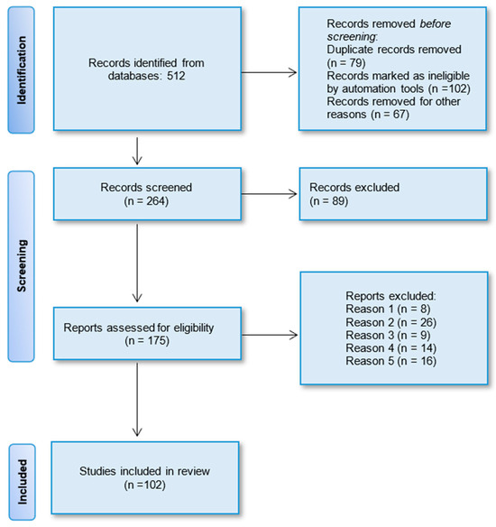 As mentioned earlier, the authors adhered to the recommended guidelines of the Preferred Reporting Items for Systematic Reviews and Meta-Analyses (PRISMA) to conduct systematic reviews. Initially, 512 potentially relevant articles were identified from the four selected databases based on their titles. After removing duplicates, a total of 264 studies remained. Subsequently, through the evaluation of abstracts, 89 articles were excluded due to insufficient data and divergent study strategies. This left 175 full papers for a detailed analysis. Ultimately, 102 full-text articles were selected for this systematic review. The PRISMA flow chart illustrating the selection process of the studies is depicted in Figure 4.