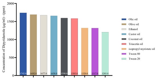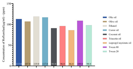 Furthermore, oleic oil exhibits greater solubility for dipyridamole, with a concentration of 1742 μg/mL, followed by olive oil at 1692 μg/mL and castor oil at 1658 μg/mL, surpassing the other oils. Furthermore, oleic oil exhibits a greater capacity for solubilizing roflumilast, with a measured value of 113 μg/mL, compared to olive oil, which measured 107 μg/mL—other oils showed even lower solubilizing activity [68].