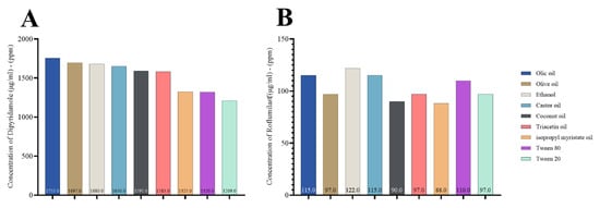Concentration of dipyridamole and roflumilast combination (μg/mL)–(ppm) in oils, surfactant, and co-surfactant; (A) dipyridamole and (B) roflumilast.