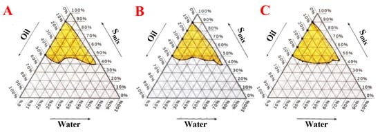 Ethanol is a low-molecular-weight co-surfactant that decreases the tension between two interfaces and enhances the movement of the hydrocarbon tail of the oil; this enables the oil to more easily enter the water phase [55]. In the present study, Formula G1 (Smix 1 (Tween 80):2 (ethanol) (Figure 5A), Formula G2 (Smix 1 (Tween 80):1 (ethanol) (Figure 5B), Formula G3 (Smix 2 (Tween 80):1 (ethanol) (Figure 5C).