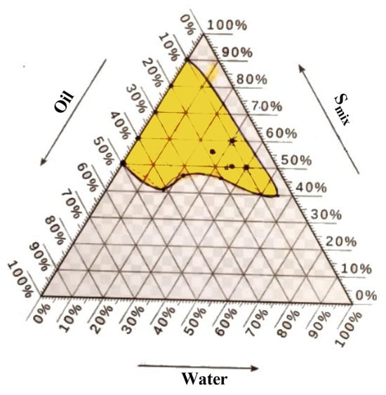 The findings of the solubility study shed light on which components should proceed to the actual formulation step. Only oleic was selected for the oil phase, and the Tween 80 was considered part of the surfactant mixture (Smix) in various ratios with used co-solvents (ethanol) [52]. The surfactants chosen for o/w nanoemulsion preparation should have a hydrophilic–lipophilic balance (HLB) value between 12 and 18, a condition that both surfactants under study fulfilled [53]. Co-surfactants usually are short- or medium-chain alcohols with carbon atoms not more than eight atoms, and they allow a reduction in the amount required of surfactant and consequently lower safety-related issues since the biological toxicity of surfactants is usually higher than that of short-chain organic co-surfactants [53].