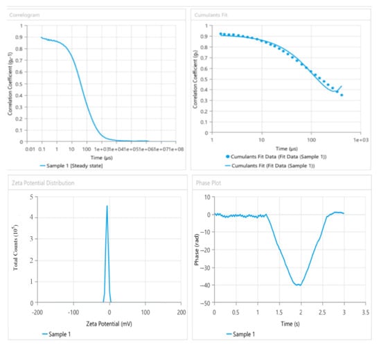 The zeta potential is a metric used to measure nanoemulsions’ surface charge characteristics and physical stability [64]. The zeta potential is a method used to analyze the surface charge of nanocrystals, providing valuable insights into the physical properties of a nanodispersion. A large positive or negative zeta value signifies the presence of electrostatic repulsion that prevents particles from coming close to each other. A low zeta value suggests that the particles will likely aggregate or flocculate due to Van der Waals interactions that bring the particles closer together. All findings, except for zeta values within the range of −30 mV to +30 mV, demonstrate that the dispersion exhibits sufficient repulsion among particles to establish a stable colloidal system [65].