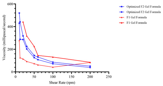 Viscosity values of formula at different shear stress (optimized formula versus F1 gel formula).
