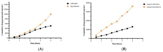 Permeability study of (A) pure roflumilast and dipyridamole and (B) nanogel roflumilast and dipyridamole.