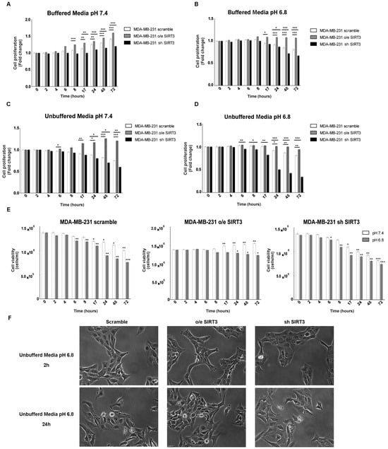 SIRT3 overexpression increases cell survival of MDA-MB-231 in buffered and unbuffered medium. (A) MDA-MB-231 proliferation at different time points in buffered media at a pHe of 7.4. (B) MDA-MB-231 proliferation at different time points in buffered media at a pHe of 6.8. (C) Proliferation rate of MDA-MB-231 clones in unbuffered media at a pHe of 7.4 at different time points. (D) Proliferation rate of MDA-MB-231 clones in unbuffered media at a pHe of 6.8 at different time points. (E) Cell viability of MDA-MB-231 scramble, o/e SIRT3, and sh SIRT3 after 2 h, 4 h, 6 h, 8 h, 17 h, 24 h, 48 h, and 72 h in unbuffered media at a pHe of 7.4 and 6.8. Data are represented as mean ± SD. * p < 0.05, ** p < 0.01, and *** p < 0.001. (F) Images of MDA-MB-231 cells and clones after 2 and 24 h in unbuffered media, pH 6.8 taken at 20× magnification.