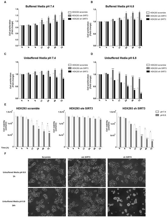 SIRT3 overexpression increases cell survival of HEK293 in buffered and unbuffered medium. (A) HEK293 proliferation at different time points in buffered media at a pHe of 7.4. (B) HEK293 proliferation at different time points in buffered media at a pHe of 6.8. (C) Proliferation rate of HEK293 clones in unbuffered media at a pHe of 7.4 at different time points. (D) Proliferation rate of HEK293 clones in unbuffered media at a pHe of 6.8 at different time points. (E) Cell viability of HEK293 scramble, o/e SIRT3, and sh SIRT3 after 4 h, 8 h, 17 h, 24 h, 48 h, and 72 h in unbuffered media at a pHe of 7.4 and 6.8. Data are represented as mean ± SD. * p < 0.05, ** p < 0.01, and *** p < 0.001. (F) Images of HEK293 cells and clones after 2 and 24 h in unbuffered media, pH 6.8 taken at 10× magnification.