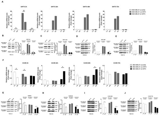 In the last few years, it has been demonstrated that carbonic anhydrases (CAs) can generate and maintain the pH gradient in cancer cells []. CAs can have different localizations inside the cells []. Since our paper focuses on SIRT3, a mitochondrial sirtuin, we investigated the role of CAVB, known to be expressed in the mitochondrial matrix, whose activity is increased by SIRT3 []. First, we investigated if the mRNA expression of SIRT3 and CAVB was influenced by pHe and unbuffered conditions. We checked the SIRT3 mRNA level in scrambled, SIRT3-overexpressing, and SIRT3-silenced MDA-MB-231 cells kept in unbuffered medium from 2 to 72 h. After 2 h, SIRT3 expression showed a decrease at a pHe of 6.8 compared to 7.4 both in scrambled and transfected cells (Figure 3A). However, such rapid decrease was not present from 24 to 72 h of treatment (Figure 3A). The same experiment was performed to check SIRT3 protein levels. Again, we observed a decreased in SIRT3 protein after 2 h at a pHe of 6.8 compared to a pHe of 7.4 in the scramble, SIRT3-overexpressing and silenced cells (Figure 3B). Reduced SIRT3 expression a pHe of 6.8 was observed in SIRT3-overexpressing cells after 24 h and in SIRT3-silenced cells after 48 h (Figure 3C,D). Finally, no differences in SIRT3 expression were observed after 72 h or treatment (Figure 3E). Taken together, these results indicate the presence of an adaptation mechanism regulating endogenous SIRT3 expression in the presence of a low pHe. mRNA and protein levels of CAVB were also analyzed. In MDA-MB-231 scrambled and SIRT3-overexpressing cells, the qPCR results showed a significant decrease of CAVB at pHe 6.8 compared to 7.4 (Figure 3F). Interestingly, an increase in CAVB mRNA was observed in SIRT3-silenced cells after 24 h and 48 h of exposure to pHe 6.8 (Figure 3F). This can probably indicate that SIRT3 knockdown cells try to compensate for SIRT3 absence by increasing the expression of CAVB mRNA because of protracted treatment at a pHe below physiological conditions. Analysis of CAVB protein showed a decrease at pHe 6.8, from 2 h to 48 h for the MDA-MB-231 scrambled cells. In the case of SIRT3-silenced cells, the CAVB protein increased at pHe 6.8 after 2 h to then decrease at 24 h and 48 h (Figure 3G–I). Considering the increase in CAVB mRNA in SIRT3-silenced cells, we suppose that there might be some translational control, block, or increased turnover of the CAVB protein that does not allow its accumulation. No changes in CAVB were observed in SIRT3-overexpressing cells (Figure 3G–J). These data suggest that a low pHe, time of exposure to a low pHe, and a lack of SIRT3 can affect CAVB protein expression.