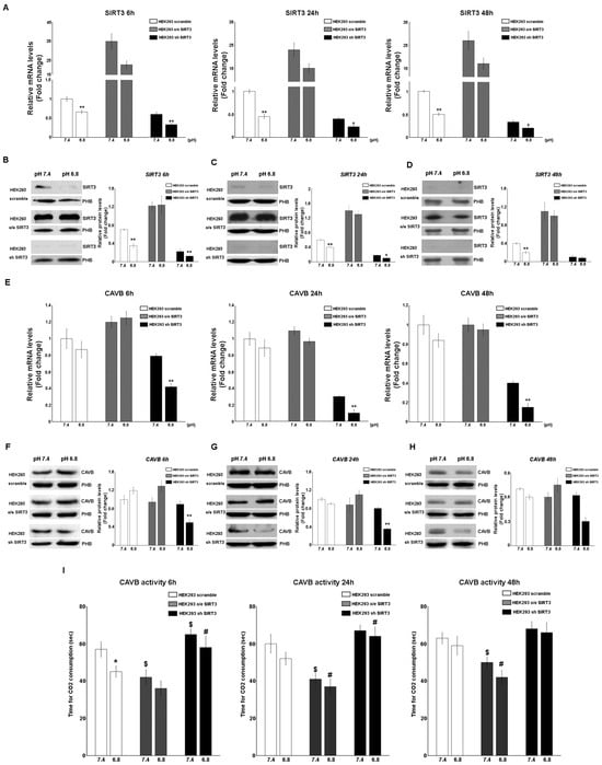 Modulation of SIRT3 and CAVB in HEK293 during treatment with acidic medium. (A) Relative mRNA levels of SIRT3 in HEK293 clones after 6, 24, and 48 h of unbuffered medium at a pHe of 7.4 and 6.8. (B) Western blot showing SIRT3 expression in HEK293 clones after 6 h of treatment with unbuffered media at a pHe of 7.4 and 6.8. Prohibitin (PHB) was used as a mitochondrial loading control. Densitometric analysis of SIRT3 protein expression obtained by Western blot after treating HEK293 clones for 6 h with unbuffered medium at a pHe of 7.4 and 6.8. (C) Western blot showing SIRT3 expression in HEK293 clones after 24 h of treatment with unbuffered media at a pHe of 7.4 and 6.8. Prohibitin (PHB) was used as a mitochondrial loading control. Densitometric analysis of SIRT3 protein expression obtained by Western blot after treating HEK293 clones for 24 h with unbuffered medium at a pHe of 7.4 and 6.8. (D) Western blot showing SIRT3 expression in HEK293 clones after 48 h of treatment with unbuffered media at a pHe of 7.4 and 6.8. Prohibitin (PHB) was used as a mitochondrial loading control. Densitometric analysis of SIRT3 protein expression obtained by Western blot after treating HEK293 clones for 48 h with unbuffered medium at a pHe of 7.4 and 6.8. (E) Relative mRNA levels of CAVB in HEK293 clones after 6, 24, and 48 h of unbuffered medium at a pHe of 7.4 and 6.8. (F) Western blot showing CAVB expression in HEK293 clones after 6 h of treatment with unbuffered media at a pHe of 7.4 and 6.8. Prohibitin (PHB) was used as a mitochondrial loading control. Densitometric analysis of CAVB protein expression obtained by Western blot after treating HEK293 clones for 6 h with unbuffered medium at a pHe of 7.4 and 6.8. (G) Western blot showing CAVB expression in HEK293 clones after 24 h of treatment with unbuffered media at a pHe of 7.4 and 6.8. Prohibitin (PHB) was used as a mitochondrial loading control. Densitometric analysis of CAVB protein expression obtained by Western blot after treating HEK293 clones for 24 h with unbuffered medium at a pHe of 7.4 and 6.8. (H) Western blot showing CAVB expression in HEK293 clones after 48 h of treatment with unbuffered media at a pHe of 7.4 and 6.8. Prohibitin (PHB) was used as a mitochondrial loading control. Densitometric analysis of CAVB protein expression obtained by Western blot after treating HEK293 clones for 48 h with unbuffered medium at a pHe of 7.4 and 6.8. Student’s t-test was used to determine the statistical significance. (I) CAVB activity after 6, 24, and 48 h treatment, measured as the time required for the CO2 in the Maren buffer to dissolve. Two-way ANOVA with the Bonferroni test was used in (I). Data are represented as mean ± SD. * p < 0.05, ** p < 0.01. *, significantly different from scrambled cells. $, #, significantly different from the other two groups.