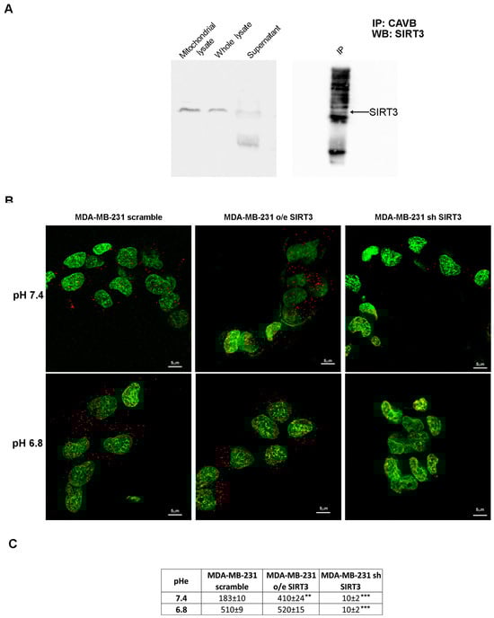 SIRT3 interacts with CAVB. (A) Mitochondrial extract from MDA-MB-231 scrambled cells was immunoprecipitated with an anti-CAVB antibody, electrophoresed on an SDS-polyacrylamide gel, and immunoblotted with an anti-SIRT3 antibody. (B) Proximity ligation assay of SIRT3 and CAVB; the interactions are shown as red dots, and nuclei are stained with Sytox green. Images were taken at 60×, and the scale bar is indicated in the figure. (C) The number of interactions (red dots in the confocal images) for scramble, o/e SIRT3, and sh SIRT3 cells is reported as means ± standard deviations. ** p < 0.01, and *** p < 0.001. Fifty cells for each group were analyzed using Image J software v1.51 (NIH, Bethesda, MD, USA).