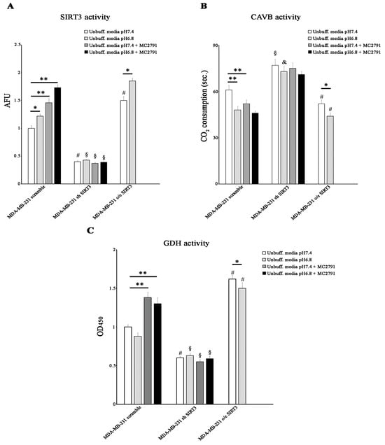 Since SIRT3 and CAVB are localized both in the mitochondrial matrix and since we have shown, for the first time, that they interact, we hypothesized that SIRT3 could regulate CAVB activity. To better analyze the role of SIRT3, we also treated scrambled and SIRT3-silenced cells with the SIRT activator MC2791 []. The effect of MC2791 on MDA-MB-231 scrambled is shown in Supplementary Figure S2, where 50 µM of the compound was able to increase SIRT3, reaching the same effect due to SIRT3 overexpression after 2 h and 4 h of treatment. Moreover, Figure S2 also shows that treatment of scrambled cells with MC2791 increased cell viability at 24, 48, and 72 h treatment similar to what was observed in SIRT3-overexpressing cells. When cells were treated with unbuffered RPMI at pHe 7.4, SIRT3 activity was consistent with protein levels. At pHe 6.8, a significant increase in SIRT3 activity was detected in the scrambled and SIRT3-overexpressing cells. Moreover, we observed that 50 µM of the SIRT3 activator MC2791 increased SIRT3 activity in MDA-MB-231 scrambled cells at both pHe 7.4 and 6.8. These data demonstrate that the acidification of the growth medium induced an increase in the catalytic activity of SIRT3 (Figure 6A). We also measured the CAVB activity in the MDA-MB-231 cell line. CAVB activity was higher in SIRT3-overexpressing cells than in scrambled or silenced cells at both pHe 7.4 and 6.8. Moreover, CAVB activity increased in the scrambled and overexpressing cells in the presence of acidic pH (6.8) (Figure 6B) in accordance with SIRT3 activity (Figure 6A). These results are similar to those obtained in HEK293 cells (Figure 4G). Importantly, treatment with 50 µM MC2791 increased CAVB catalytic activity at pHe 7.4 but not at pHe 6.8 in scrambled cells. On the contrary, we did not observe any change in CAVB catalytic activity in SIRT3-silenced cells when treated with MC2791 (Figure 6B). To check if SIRT3 downstream targets were also upregulated, we investigated the activity of GDH. We determined if acidic pHe could modulate GDH activity in MDA-MB-231 scramble, overexpressing, and silenced cells. As shown in Figure 6C, GDH activity was higher in overexpressing SIRT3 cells at pHe 7.4 and pHe 6.8 compared to scrambled and silenced cells (Figure 6C). However, an increase in GDH activity was observed in the scrambled cells after treatment with MC2791 (Figure 6C). Interestingly, GDH activity was not influenced by pHe 7.4 or 6.8, or by MC2791 in SIRT3-silenced cells (Figure 6C).