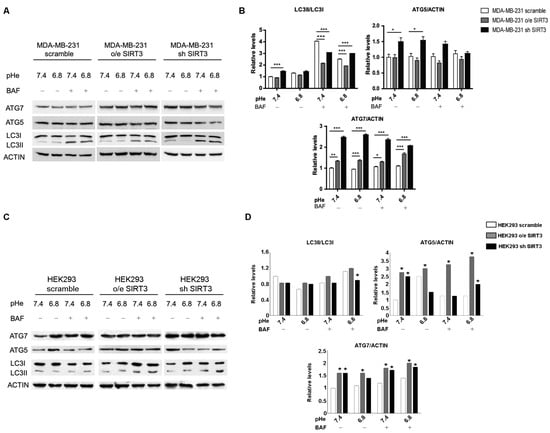 Induction of autophagy may represent an adaptive mechanism for cancer cells exposed to an acidic environment [,,] and the ability to maintain a functional autophagic flux in response to pHe changes may vary among different types of cancer []. Starting from these considerations, we investigated the autophagic response of MDA-MB-231 scrambled and SIRT3 clones. We measured LC3I, LC3II, ATG5-ATG12, and ATG7 accumulation in the presence or absence of 100 nM Bafilomycin-A1, a vacuolar ATPase inhibitor. LC3II/LC3I ratio, in the absence of Bafilomycin, showed an increase in MDA-MB-231 silenced cells at a pHe of 7.4 (Figure 7A,B). The inhibition of lysosomal acidification and autophagic flux, induced by Bafilomycin-A1, revealed that the LC3II/LC3I ratio was significantly lower in SIRT3-overexpressing cells compared to scrambled and silenced cells at a pHe of 7.4 and 6.8. In addition, the accumulation of LC3II was significantly higher in SIRT3 scrambled cells compared to SIRT3-silenced cells at a pH of 7.4 whereas at pH 6.8, SIRT3-silenced cells increased LC3II accumulation to levels above those of SIRT3 scrambled cells, suggesting an increased flux (Figure 7A,B). Then, we analyzed the ubiquitin-like conjugation systems, considering the expression of ATG7 and ATG5–ATG12 proteins. While no significant changes were observed for ATG5-ATG12, except the increase in SIRT3-silenced cells at both pHs, ATG7 was increased in SIRT3-silenced and overexpressing cells before and after Bafilomycin-A1 treatment (Figure 7A,B). Autophagy induction was also assessed in HEK293 scramble, SIRT3-overexpressing, or silenced cells. In this case, the LC3II/LC3I ratio did not show any significant modulation in unbuffered conditions (Figure 7C,D). However, SIRT3-silenced cells showed increased LC3II accumulation in the presence of Bafilomycin-A1 at a pH of 6.8, suggesting an increase in autophagic flux (Figure 7C,D). Differences were clearer with the ATG7 and ATG5–ATG12 proteins. In fact, we observed an increase in ATG7 in both HEK293 overexpressing and silenced cells compared to scrambled cells in the presence or absence of Bafilomycin at pH 7.4 and 6.8 (Figure 7C,D). ATG5–ATG12 levels increased only in SIRT3-overexpressing cells compared to scrambled and silenced ones (Figure 7C,D). In the presence of Bafilomycin, such a difference was maintained, with SIRT3-silenced cells accumulating more ATG5–ATG12 compared to scrambled cells (Figure 7C,D).