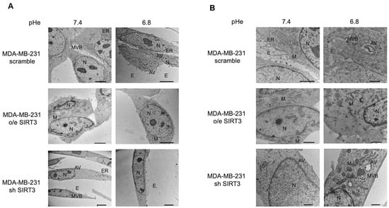 Morphology and autophagosome formation in MDA-MB-231 scramble, o/e SIRT3, and sh SIRT3 cells. (A) MDA-MB-231 scramble, o/e SIRT3 and sh SIRT3 cells were grown in unbuffered medium at pHe 7.4 or 6.8 for 8 h. Afterward, cells were analyzed by transmission electron microscope (TEM). (B) High magnification images of MDA-MB-231 clones by TEM. N = nucleus, M = mitochondria, ER = Endoplasmic Reticulum, E = Exosome, MVB = Multi vesicular body, AV = autophagic vacuole. Scale bar = 10 µm.