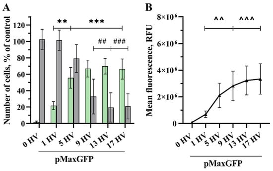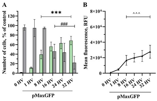 A significant increase in transfected cells (39%) compared to the control was achieved after exposure using 8800 V/cm HV pulses, where cell viability remained at 95% and MFL 1.7 × 106 RFU (related fluorescence units). Although the highest transfection efficiency was achieved using 32 HV pulses, reaching 68%, the cell viability here dropped to 22%. When exposed to 16 HV pulses, transfection efficiency and MFL were 56% and 2.0 × 106 RFU, respectively, maintaining cell viability at 46%.