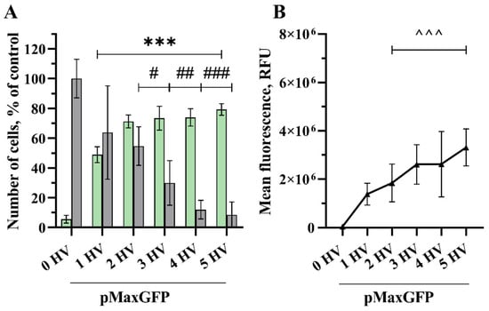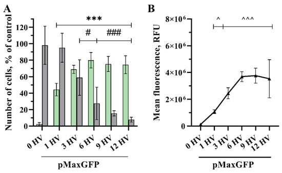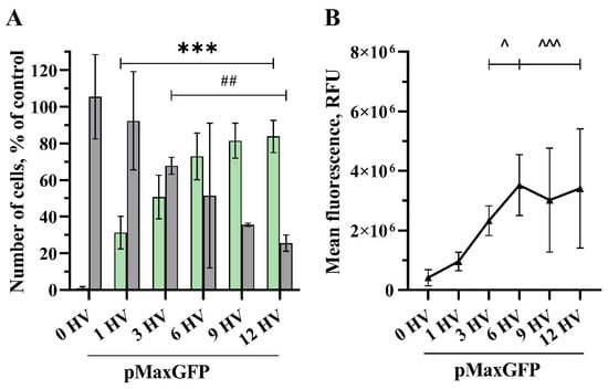 The quantity of transfected cells and the intensity of their fluorescence increased as the number of 1200 V/cm HV pulses increased (Figure 3). Applying 1 HV pulse of 1200 V/cm was sufficient to significantly increase the number of transfected cells (31% and 0.961 × 106 RFU), while increasing the number of pulses resulted in higher transfection efficacy, peaking at 12 HV pulses with 84% transfected cell number and the MFL of 3.413 × 106 RFU. No significant increase was observed comparing 6 and 12 HV pulses. Applying three HV pulses, transfection efficacy reached 51% with the MFL of 2.330 × 106 RFU, but cell viability dropped significantly to 68%. The cell viability decreased with the increasing number of pulses applied, and 12 HV pulses resulted in a huge drop, with just 25% of viable cells.
