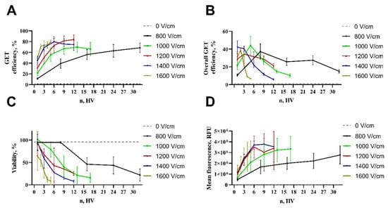 Multiple reports show that higher electric field strength leads to better transfection but reduces cell viability [47,48,49]. Analogously to our research (Figure 6A), it was showed that when applying lower electrical field strength (800 V/cm), one pulse is not enough to give significant transfection efficiency [50], although a suitable number of pulses can lead to significant GET efficiency. According to our findings, a significant GET can be achieved with lower electrical field strength; the best transfection was achieved by applying a stronger electrical field and fewer pulses (Figure 6A). For instance, field strengths between 1.0 and 1.5 kV/cm are ideal for GET, but stronger electric fields result in increased cell death [16]. The primary cause of cell death following electroporation remains unspecified [51]. Nevertheless, the literature states several different mechanisms in regard to cell death after electroporation, such as irreversible membrane damage [52], ATP depletion [53], disruption of intercellular ion homeostasis [52], mitochondrial damage [54], increase of ROS [55], DNA damage [56], and protein damage [57] or loss of vital intracellular molecules [14].