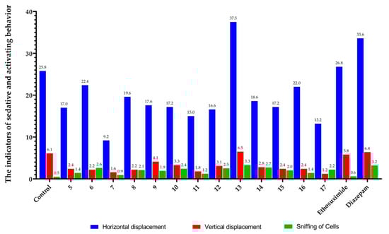 Graphical representation of the activity of the control group: compounds 5–17, ethosuximide, and diazepam in the “open field” model.