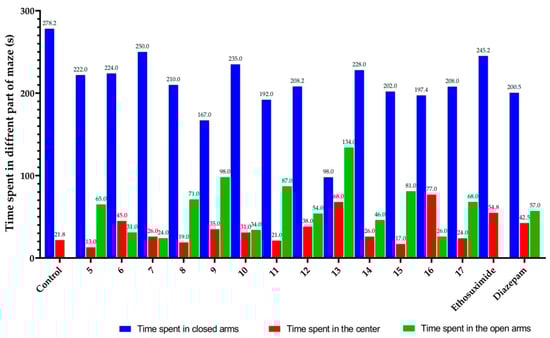 Graphical representation of the time mice spent in different parts of the maze after receiving compounds 5–17 and the compared drugs in the EPM model.