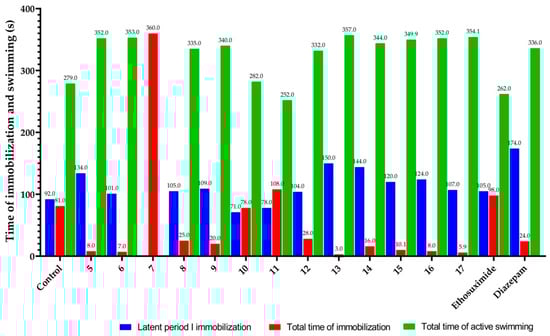 In the “forced swimming” model (Table 5, Figure 3) in the control mice, the first immobilization occurs after 92 s. Many of the studied compounds (5, 6, 9, 12, 13, 14, 15, 16, and 17) tested at a dose of 50 mg/kg statistically significantly increased the latent period of the first immobilization and decreased the total time immobilization. Under the influence of compound 7, immobilization was completely observed. Under the influence of compounds 10 and 11, an increase in immobilization time was observed.
