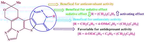 Summarizing the structure–activity relationship (SAR) study, the incorporation of an additional condensed triazine ring was found to enhance anticonvulsant, sedative antianxiety, and antidepressant activities across various biological tests. However, the functional group substituted on the nitrogen atom of the triazine ring can change the level of activity (Figure 4).