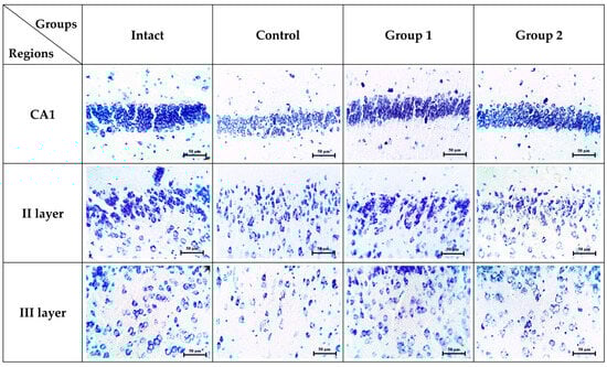 The results of the histological examination of the hippocampus CA1 region and II and III layers of the entorhinal cortex in various experimental groups: intact group—normal animals; control group—PTZ-treated animals; group 1—animals treated with compound 13; and group 2—animals treated with PTZ and compound 13. Magnification of ×400 (Nissl stain).