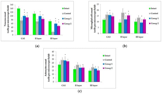 The hippocampi of animals from experimental group 1 showed similarities to those of the intact animals. In the CA1 region, neurons were mostly neatly arranged with clear nuclei and visible nucleoli, and only a few exhibited chromatolysis of Nissl bodies. Morphometric analysis revealed that the count of pyramidal cells in this group (100.40 ± 7.633 cells) was significantly lower compared to the intact animals, yet significantly higher than in the pentylenetetrazole-treated group (p < 0.05). Similarly, the counts of microglial cells (15.60 ± 2.413 cells) and astrocytes (28.40 ± 4.993 cells) were also significantly higher compared to the intact group (p < 0.05) (Figure 6b,c).