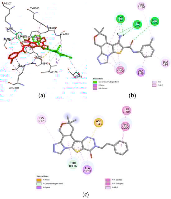 The steric parameters we obtained indicate that compounds 8 and 13 are mirror-oriented relative to the binding site and form an angle of 97.2° relative to each other (Figure 7a). Compound 8 exhibited three hydrogen bonds with amino acid residues Tyr62 of chain B, Tyr97, and Arg207 of chain C (Figure 7b). The maximum distance was observed in the NH2 group of Arg207 with a value of 3.3 Å at an interaction angle of 41.91°. In addition, hydrophobic interactions with Arg180, Leu99, Ala45, and Phe200 were also observed for compound 8 (Figure 7b). In contrast to compound 8, compound 13 did not exhibit any hydrogen bonding. The interaction is facilitated by hydrophobic forces with amino acid residues Lys173, Tyr205, Phe200, and Ala201 (Figure 7c). Furthermore, an anionic bond with Asp43 of chain B was observed for compound 13.