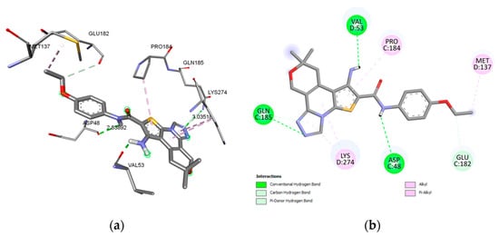 Hydrogen bonds were observed with amino acid residues Asp48, Val53, and Gln185 with distances of 2.8 Å, 1.9 Å, and 3.0 Å, respectively. The hydrophobic type of binding occurred due to residues of Pro184, Met137, and Lys274 (Figure 8b).