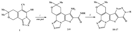 Synthesis of tetracyclic (compounds 2–9) and pentacyclic (compounds 10–17) heterocyclic compounds. (i) ClCH2CONHR, AcONa, dry EtOH, 2 h, 60 °C; (ii) DMF, MeCOOH, HCl, NaNO2/H2O, 3 h, 22 °C.