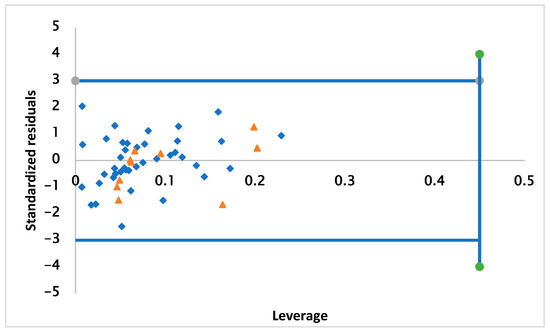 where X is the descriptor matrix of the training set and xi is the descriptor vector of the compound. The leverage threshold value is defined as h* = (3 × (K + 1))/n, where n is the amount of training and K is the number of descriptors. Compounds with hi greater than the critical leverage threshold value are chemically different from the training set and report as outliers [57].