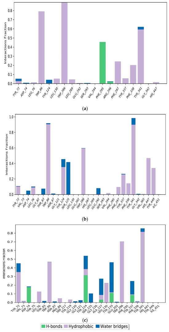 On the other hand, Figure 8c revealed that the main interactions between Donepezil and the AChE pocket site included hydrogen bonds, hydrophobic interactions, and water bridges. Residues involved in these interactions were TYR72, ASP74, TRP86, TYR124, ALA127, LEU130, TYR133, TRP286, and TYR341. Hydrophobic interactions were specifically established with residues TYR72, TRP86, LEU130, TRP286, and TYR341, with formation rates of 35%, 49%, 22%, 70%, and 82%, respectively. Hydrogen bonds were formed with residues ASP74 and TYR124, with formation rates of 18% and 30%, respectively. Water bridges were created by residues ALA127 and TYR133, with occupancy rates of 20% and 35%, respectively.