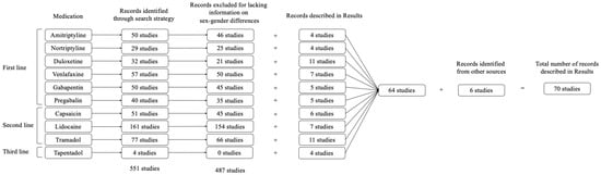Amongst chronic pain syndromes, neuropathic pain often constitutes a devastating experience for patients and causes them to be affected by a severe reduction in their quality of life, representing a clinical challenge for their healthcare providers, especially considering the sobering results of available treatments [16,17,18]. Indeed, up to 60% of patients with neuropathic pain fail to achieve an adequate response to the medications recommended to treat this pain condition [19]. As previously demonstrated for other medications [11,13,20,21], we hypothesized that responses to these medications may differ between men and women. To evaluate this hypothesis, we conducted a comprehensive literature review aimed at investigating sex-gender differences in the efficacy and safety of medications recommended for the treatment of neuropathic pain.