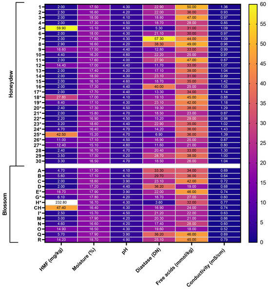 - Chakir, A.; Romane, A.; Marcazzan, G.L.; Ferrazzi, P. Physicochemical Properties of Some Honeys Produced from Different Plants in Morocco. Arab. J. Chem. 2016, 9, S946–S954. [Google Scholar] [CrossRef]