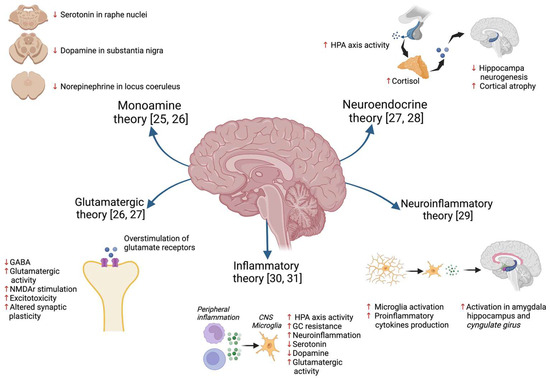 Several hypotheses have been proposed over time to explain the pathophysiology of MDD [24] (Figure 1), such as the classic “monoamine hypothesis”, which proposes that MDD is the result of the selective depletion of monoamines (serotonin, dopamine, and noradrenaline) in several areas of the central nervous system (CNS) [25,26]. Another theory is the “glutamate hypothesis”, which postulates that this neurotransmitter is also relevant in the formation of depressive symptoms and cognitive impairment through overstimulation of NMDA (N-methyl-D-aspartate) glutamate receptors, alteration of the AMPA (α-amino-3-hydroxy-5-methyl-4-isoxazolepropionic acid) receptor, altered glutamate reuptake, and dysfunction of the endocannabinoid system [27]. Another theory that has been put forward is the “neuroendocrine hypothesis” involving hyperactivity of the hypothalamic–pituitary–adrenal (HPA) axis, with an increase in cortisol production and a consequent reduction in hippocampal neurogenesis and plasticity in the cortex [27,28]. Recently, the neuroinflammation hypothesis has emphasized the mechanisms of microglial activation and the consequent production of proinflammatory cytokines, which in turn causes the hyperactivation of areas of the limbic system such as the amygdala, hippocampus, and cingulate gyrus, as well as metabolic alterations in the production of neurotransmitters induced by the activation of the enzyme indolamine-2,3-dioxygenase [29]. All of these theories described above attempt to explain MDD pathophysiology and symptoms, however, the inflammatory theory has become increasingly important and has been proposed as a central element in the pathophysiology of MDD [30,31]. One of the first pieces of evidence linking inflammation and behavioral changes was reported when immunotherapy with interferon (IFN)-α was introduced as a treatment for hepatitis C, in which the presence of depressive symptoms and even suicidal ideation was observed in patients receiving IFN-α treatment, as well as some reports of cognitive alterations and alterations in EEG patterns [32,33].