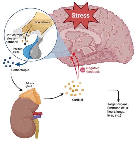 As mentioned above, one of the hypotheses proposed to explain the pathophysiology of MDD involves alterations of the HPA axis. The hypothalamus–pituitary–adrenal (HPA) axis connects the nervous and endocrine systems and is formed by the hypothalamus, pituitary, and adrenal glands [50]. The HPA axis regulates the stress response by releasing CRH by the hypothalamus, which promotes corticotropin (ACTH) release by the pituitary gland. ACTH stimulates the adrenal glands to release cortisol, triggering the “fight or flight” response. This axis has a negative feedback regulation system that mediates the production of glucocorticoids (Figure 2) [51]. Activation of the HPA axis regulates different processes such as digestion, immune responses, mood, emotions, and energy metabolism [50].