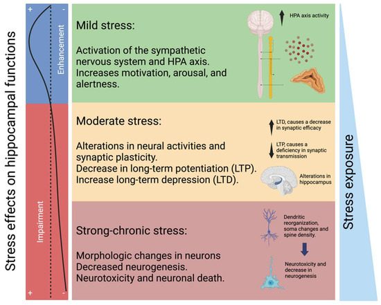 Changes in the hippocampus according to the magnitude of stress. Mild stress conditions are associated with short-term neurochemical alterations through the sympathetic nervous system, affecting motivational, arousal, and alertness functions. Moderate stress induces relatively more prolonged alterations in neural activities and synaptic plasticity. Chronic and strong stress conditions can affect hippocampal morphology, neurogenesis, and neurotoxicity. Mild stress can enhance hippocampal functions. Prolonged stress can induce alterations in hippocampal functions (left panel).