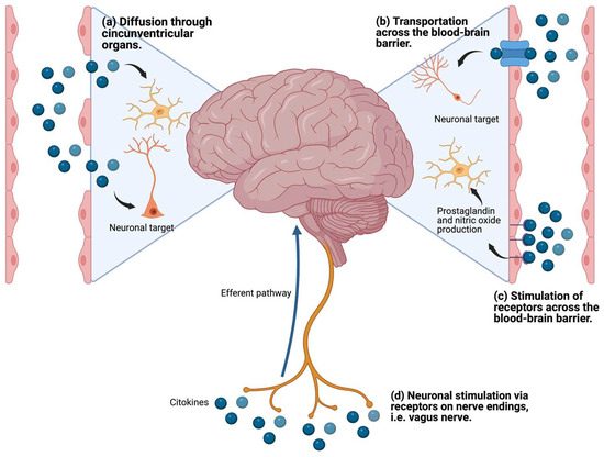 Cytokines are glycoproteins that act as messenger molecules to regulate inflammation and other cellular functions [68]. Cytokines are produced by different immune cells, parenchymal cells, endothelial and epithelial cells, fibroblasts, adipocytes, and stromal cells [68]. In addition, microglia, astrocytes, and neurons in the brain also produce cytokines. Several mechanisms by which peripheral cytokines stimulate the brain have been reported [69,70]: (i) by stimulating receptors in the blood–brain barrier (BBB) and producing metabolites in the brain; (ii) by accessing the brain through the circumventricular organs; (iii) by being carried through transporters in the BBB; and (iv) through stimulation of afferent fibers of the vagus nerve (Figure 4).