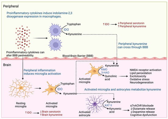 Inflammation can be triggered in response to stressors such as infection, injury, surgery, and social stress, causing increased production of inflammatory mediators such as cytokines; the intensity and duration of the stimulus determines the level of inflammatory mediators release and the effects they cause [71]. As described above, proinflammatory cytokines produced in the periphery can stimulate the brain and generate an inflammatory response caused by the activation of neurons, microglia, and astrocytes [72]. During acute and chronic stress, proinflammatory cytokines induce changes in the metabolism of tryptophan, a precursor of serotonin, in the periphery and brain [73]. One of the mechanisms involved in the activation of indolamine 2,3-dioxygenase (IDO) is found in macrophages and microglia cells. IDO promotes tryptophan metabolism to the kynurenine pathway, resulting in decreased serotonin levels in the periphery and brain [74,75]. In addition, kynurenine produced in the periphery can cross the BBB and be metabolized by kynurenine produced in the brain by activated astrocytes and microglia [76]. Kynurenine is metabolized by astrocytes by kynurenine aminotransferase II (KAT II) and generates quinolinic acid which causes decreased production of dopamine and glutamate, as well as a blockade of α7nAChR cholinergic receptors, which is associated with cognitive dysfunction [76,77]. Similarly, activated microglia metabolizes kynurenine by kynurenine 3-monooxygenase (KMO) and 3-hydroxy anthranilic acid oxygenase (3-HAO) generates kynurenic acid, which stimulates NMDA receptors and causes lipid peroxidation, oxidative stress, excitotoxicity, and neurodegeneration [76,77] (Figure 5). In addition, it has been reported that chronic stress induces a decrease in serotonergic system function with an increase in the expression of SERT and p11 in peripheral blood mononuclear cells (PBMCs) [78]. On the other hand, the oxidative stress response caused during inflammation inhibits the production of tetrahydrobiopterin, a cofactor necessary for the activity of aromatic hydroxylase enzymes, which participate in the synthesis of neurotransmitters such as serotonin, dopamine, and norepinephrine, so that their inhibition causes a deficit in the production of monoamines [76,79]. These metabolic changes are related to the development of sickness behavior in patients with systemic inflammatory responses caused by injury or infection [38]. However, as soon as the inflammation is corrected the symptoms subside [38]. In cases of chronic stress, as in MDD, the above-mentioned alterations in the HPA axis such as glucocorticoid resistance, cause dysregulation of the inflammatory response and a low-grade chronic inflammation state, which generates a dopamine and serotonin deficit [80].