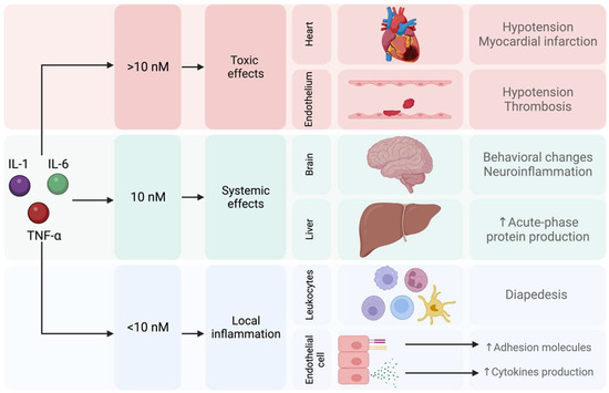 As mentioned above, inflammation plays an important role in the pathophysiology of MDD, and cytokines such as IL-1, IL-6, or TNF-α are involved. Subsequently, several mechanisms for low chronic inflammation have been investigated as new alternatives for treating MDD [104,105]. Proinflammatory cytokines have dose-dependent effects; it has been reported that a concentration below 10 nM triggers a local inflammatory response. Reaching a concentration of 10 nM of proinflammatory cytokines generates systemic effects that affect the brain and trigger behavioral changes such as sickness behavior. Finally, a concentration of proinflammatory cytokines higher than 10 nM is associated with toxic effects on the heart and endothelium [106] (Figure 6).