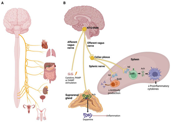 Acetylcholine (Ach) down-regulates the inflammatory response by suppressing the production of proinflammatory cytokines in peripheral immune cells through α7 nicotinic acetylcholine receptors (α7nAchRs) [108]. Cholinergic and catecholaminergic signals regulate lymphocyte activation in chronic inflammatory and autoimmune diseases [109]. CAP is a neural mechanism that inhibits the release of proinflammatory cytokines via afferent signaling by the vagus nerve and α7 receptors [110]. The CAP begins with afferent signaling from the vagus nerve, activated by cytokines, PAMPs, or DAMPs which, in turn, stimulate the nucleus of the solitary tract. Afterward, vagus efferent signals descend to the spleen to regulate the production of proinflammatory cytokines through Ach released by splenic T lymphocytes and dopamine released by the suprarenal gland (Figure 7) [110,111].